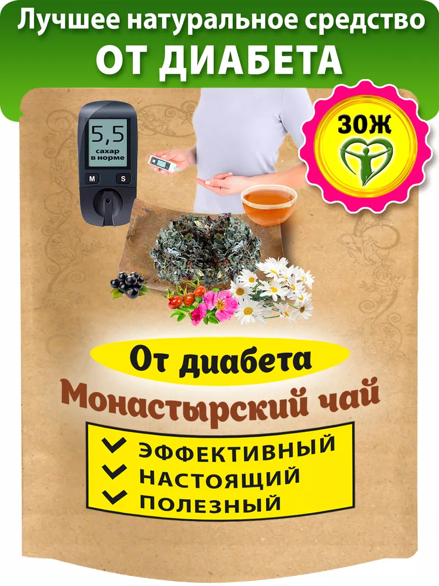 Монастырский чай от диабета - это комплекс из 8 трав, который снижает уровень сахара и холестерина, укрепляет сосуды, нормализует давление. Показан диабетикам и используется как диабетические продукты. В состав монастырского чая входят следующие компоненты: 1) Элеутерококк - повышает общий тонус организма, стимулирует умственную активность, нормализует работу нервной системы. 2) Зверобой - снижает сахар, нормализует холестерин. 3,4) Хвощ полевой, Козлятник (галега) - обладают общеукрепляющим действием, снижают сахар. 5,6) Черника, шиповник - мощный антиоксидант. 7) Ромашка - источник витаминов, понижает уровень сахара, подавляет активность ферментов ALR2 и сорбитола. 8) Стручки фасоли - восполняют запасы аминокислот, нормализуют работу поджелудочной железы. Заваривают из расчета 1 ст. л. на 200 мл кипятка. Наилучшего эффекта можно достигнуть при регулярном применении. Не является лекарством.